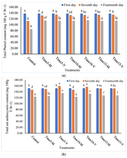 The effect of different treatments showed that the highest TAC was found in 5 and 10 min US-VP with the amount of 148.01 and 146.60 mg 100 g−1 F.W., respectively. Also, it had a significant (p < 0.01) difference from other treatments (Table 4). The effect of storage time showed that the highest TAC was recorded on the first and seventh day, with the amount of 151.33 and 150.81 mg 100 g−1 F.W., respectively, with a significant (p < 0.01) difference compared to the fourteenth day (Table 4). The interaction effects of different treatments and storage time showed that the highest TAC was found in 10 and 15 min US-VP treatment on the seventh day (Figure 4b).
