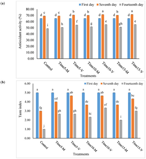 The highest taste index score (4.33) was obtained in 10 min US-VP. However, it was not significantly (p < 0.01) different from 5 and 15 min US-VP (4.11) and 10 min US–passive MAP (3.88) (Table 4). The effect of storage time showed that a high score (5) was obtained on the first day with a significant (p < 0.01) difference compared with the other days (Table 4). The interaction effects of different treatments and storage time showed that the high score was obtained in all the treatments on the first day without a significant (p < 0.01) difference between them (Figure 5b).