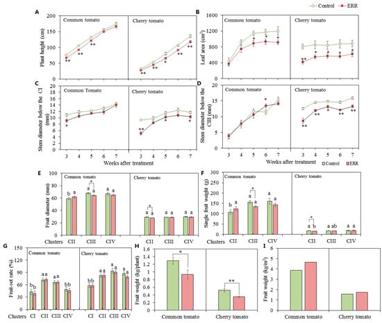 Although two tomato types were planted at five fully expanded leaves simultaneously, common tomato displayed higher plant height (Figure 1A and Figure S1), leaf area (Figure 1B), and stem diameter below CI (Figure 1C) than in cherry tomato after three weeks of transplanting. In this study, the cocopeat strip was used as the control. Plant growth during three to seven weeks after treatment in two types was markedly inhibited by ERR treatment, which was more severe in cherry tomato than in common tomato (Figure 1). Firstly, the plant height in ERR-cultivated common tomato was significantly lower than that in the control from the three to five weeks after treatment, while the cherry tomato was from three to seven weeks after treatment (Figure 1A). Secondly, ERR-cultivated common tomato showed significantly decreased leaf area from five to seven weeks after treatment, but cherry tomato was from three to seven weeks (Figure 1B). Thirdly, we measured stem diameter below CI and CIII, the inhibition effects of ERR on stem diameter were more severe on cherry tomato than on common tomato as compared with the control (Figure 1C,D). Meanwhile, the magnitude of reduction was larger in CIII than in CI (Figure 1C,D).