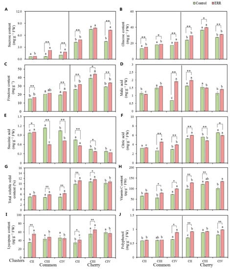 Citric acid is the main accumulated organic acid in both types. The content of citric acid in CIII and CIV of common tomato was significantly increased by the ERR treatment, which was the opposite in cherry tomato (Figure 2F). CII showed significantly higher citric acid and malic acid in ERR treatment than the control in cherry tomato (Figure 2D,F). Except for CII in common tomato, other clusters exhibited a significantly lower content of succinic acid in ERR treatment than the control (Figure 2E).