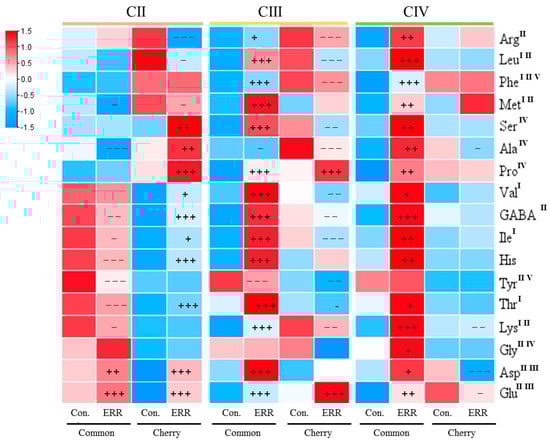 A total of 17 amino acids were detected in this study. To evaluate the contribution of amino acids to tomato fruit flavor and nutritional value, we classified them into four groups, including officinal, tasty, sweet, and aromatic, respectively (Figure 3). In the case of common tomato, both CIII and CIV contained significantly higher or extremely significantly higher levels of amino acids under the ERR treatment than the control. The level of sweet amino acids (Ser and Pro) was significantly higher under the ERR than the control in CIII and CIV. The level of tasty amino acids (Asp and Glu) was significantly higher under the ERR than the control from CII to CIV. In the case of cherry tomato, the promotion effects of ERR on amino acid accumulation were mainly in CII, for example, most of the amino acid content was higher under the ERR than the control in CII, while only the Glu and Pro were higher under the ERR than the control in CIII, no different amino acids were observed in CIV. CII of cherry tomato showed extremely higher sweet amino acids (Ser, Pro, and Ala), tasty amino acids (Asp and Glu), and officinal amino acid (GABA) under the ERR treatment than the control.