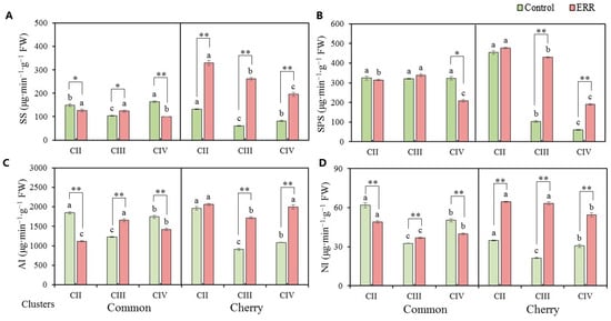 The changes in soluble sugars in fruits could be attributed to the differences in enzyme activity. As shown in Figure 4, the influence of ERR on the activity of enzymes involved in soluble sugar metabolism was different between types and among clusters. The enhancement effect of ERR on enzyme activity in cherry tomato (3–4 folds) was stronger than that in common tomato. As compared with the control, activity of SS and NI (Figure 4A,D) in ERR-treated cherry tomato was extremely significantly higher from CII to CIV, while activity of SPS and AI (Figure 4B,C) was significantly increased in CIII and CIV. Therefore, activity of enzymes involved in sucrose metabolism was enhanced by ERR, mainly in CIII and CIV (Figure 4). However, in the case of common tomato, the activity of SS, AI, and NI was reduced by ERR in CII and CIV, which was enhanced in CIII (Figure 4A–D).