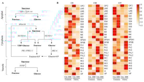 To determine whether the sucrose metabolism responds to ERR differentially between types and among clusters, we examined the expression level of sucrose metabolism genes in both types and three clusters by using RT-PCR-based expression analysis. A total of 27 genes encoding invertase (LIN5, LIN6, LIN7, VI, NI1, NI3, NI4, NI5), invertase inhibitor (VIF and CIF2), sucrose synthase (SS1, SS3, SS4, SS5 and SS6), sucrose phosphate synthase (SPSA1 and SPSB), hexokinase (HK1, HK2, HK3, HK4, HK6), and fructokinase (FK1, FK2, FK3, FKL1 and FKL2) were identified (Figure 5A,B). The responses of sucrose metabolism genes to ERR were different between types. The differentially expressed genes between CII and CIV were consistent, in which the expression of SS1, SS3, SS4, SS5, and SS6 was up-regulated by the ERR in common tomato, whereas in cherry tomato, the expression of SPSB, HK1, HK4, HK6, FK1, and FKL2 was up-regulated by the ERR (Figure 5B). In consideration of the inhibited genes, the expression of Lin5, Lin6, HK3, and VI was down-regulated by the ERR in common tomato, but only CIF2 was down-regulated by the ERR in cherry tomato. In general, ERR induced expression of genes involved in the sucrose degradation and synthesis by sucrose synthase in common tomatoes. However, in cherry tomato, the expression of genes involved in the phosphorylation of fructose and glucose, as well as sucrose phosphate synthase, was enhanced by ERR.