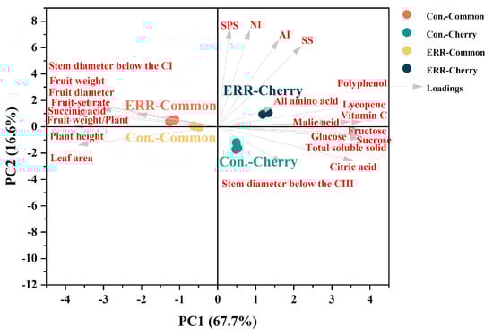 PCA was used to visualize the effects of ERR on the plant growth, fruit production, and quality of two tomato types. Overall, PC1 and PC2 explained 67.7% and 16.6% of the total variance (Figure 6) in both tomato types. The cherry and common were divided into two clear groups in the PCA scatter plot. Cherry tomato in the upper quadrants (ERR treatment) was characterized by higher fruit metabolites and activities of sucrose metabolism enzymes. Common tomato in the ERR treatment was characterized by inhibited plant growth.