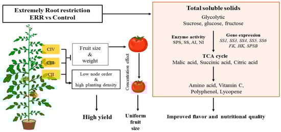 The flavor and nutritional quality of both tomato types were enhanced by Extreme Root Restriction caused by the reduction of fruit size. Meanwhile, Extreme Root Restriction enhanced enzyme activity and genes expression involved in sucrose metabolism. Together, these results indicate a typical characteristic of tomatoes grown in Extreme Root Restriction (Figure 7).