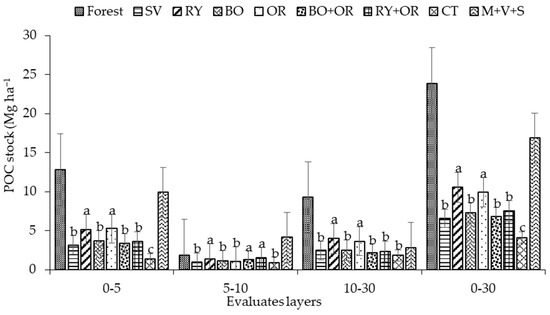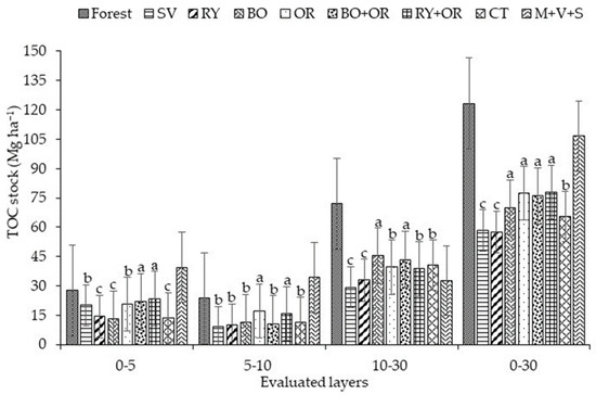In the 0–30 cm layer, the treatments with single OR and in consortium with oats (BO + OR) and rye (RY + OR) stand out; they presented the higher stocks of TOC. The SV and RY treatments presented the lowest stocks of TOC. Regarding the conventional tillage system, the no-tillage vegetable system treatments with single- and intercropped BO and OR crops (BO + OR and RY + OR) showed higher stocks of TOC than the conventional tillage system in the 0–30 cm layer (Figure 1).