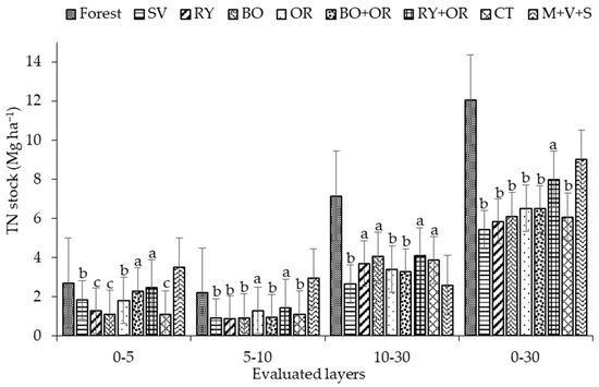 For TN stocks in the 10–30 cm layer, higher values were observed for the RY, BO, RY + OR, and conventional tillage system treatments, with a lower value found in SV treatment. The TN stock in the 0–30 cm layer was higher for RY + OR than other treatments (Figure 2). Regarding the reference area (forest), the TOC and TN stocks are proportionally higher than those found in the no-tillage vegetable system (Figure 1 and Figure 2, respectively).
