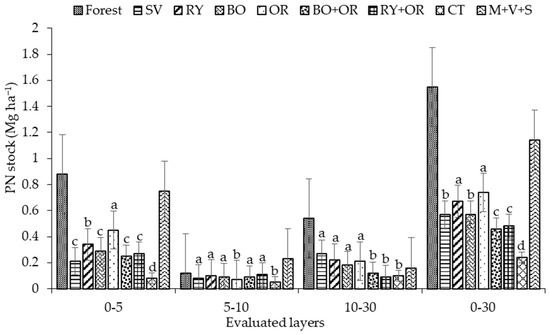 In the 0–5 cm layer, single RY and OR treatments showed the higher stocks of POC (Figure 3) and PN (Figure 4); the conventional tillage system treatment showed the lowest stocks of POC and PN. In the 5–10 cm layer, single RY treatments and intercropped RY + OR stand out with higher POC and PN stocks. It is also noteworthy that the conventional tillage system showed the lowest values regarding PN stocks (Figure 4). In general, in the 10–30 and the 0–30 cm layers, the RY and OR treatments presented the higher stocks of POC and PN, emphasizing the conventional tillage system, which, in the 0–30 cm layer, showed the lowest values.