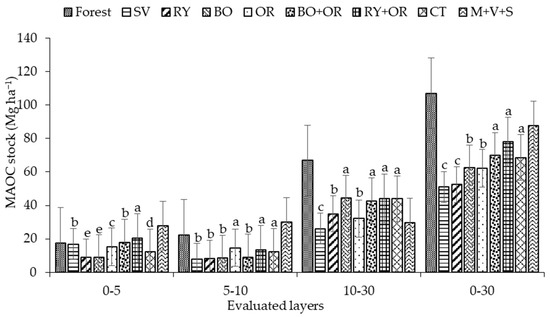 In the 0–30 cm layer, the SV treatment presented the lowest stocks of MAOC and MN due to the low phytomass production of spontaneous plants and the lower contribution of organic matter to the soil, culminating in lower stocks of C and N of the most stable fractions, as well as lower TOC and TN stocks (Figure 1 and Figure 2). In this same layer, the intercrop RY + OR treatment presented higher MAOC and MN stocks, to the detriment of the single cover plants crop and the conventional tillage system, corroborating the TOC and TN stocks. The conventional tillage system treatment showed high stocks of MAOC and MN in the 0–30 cm layer because the soil management in this system reduces the labile fraction (POC and PN), and due to the millet crop in summer that produces high C/N ratio biomass, the most stable fractions, MAOC and MN, remain in the soil in higher proportions [6,53].