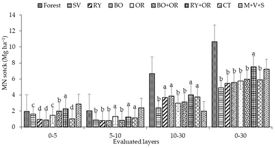 High stocks of TOC and TN in forest areas are expected because they are systems without anthropic interference. These stocks’ maintenance in the soil occurs through plant activity, which, with the constant burlap deposition, makes the environment conducive to biota activity [47,48,49]. In the treatment M + V + S, the high values of TOC and TN stocks are due to the addition of dry matter (11 Mg ha−1), associated with the non-revolving of the soil (NTS) and the use of three plant species from different botanical families [6,26]. This pattern was not observed in the CT treatment, because the soil is turned over in the CT, which fragments the millet straw, increasing its decomposition, with subsequent losses of C and N [44].
