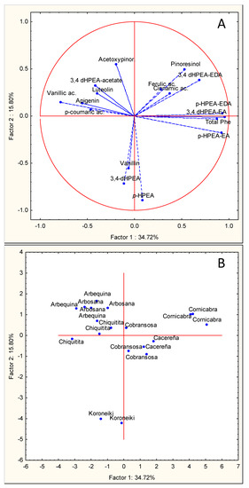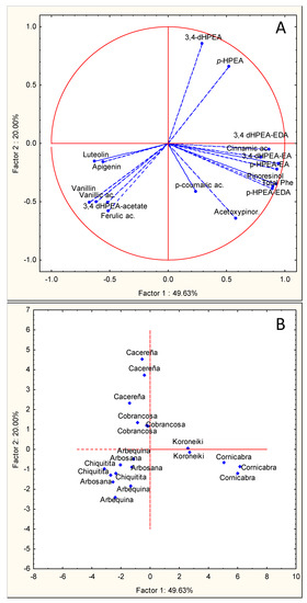 Projection showed in Figure 1B allows a clear separation of the cultivars tested. The PC1 axis perfectly separates “Cornicabra” from “Koroneiki”, both having a very high phenolic content and both located in the positive zone of the axis. “Arbequina”, “Arbosana”, and “Chiquitita” are located in the opposite part of PC1 (third quadrant), also relatively close to this axis. On the contrary, “Cobrançosa” and “Cacereña” are located along the positive region of PC2.