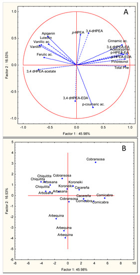 Principal component analysis of the main phenolic components of VOOs from olive cultivars “Arbequina”, “Arbosana”, “Cobrancosa”, “Cornicabra”, “Koroneiki”, “Cacereña”, and “Chiquitita” cultivated in a super-high-density orchard under cold weather conditions in the season 2014. (A) Vector distribution of the phenolic compounds. (B) Distribution of olive cultivars.