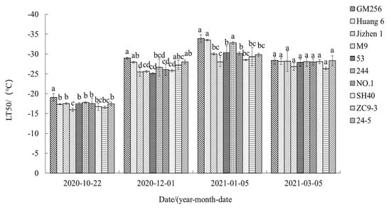 3.1. Changes of LT50 of ‘Tianhong 2’ Apple Branches Grafted on Different Interstocks under Natural Overwintering Process