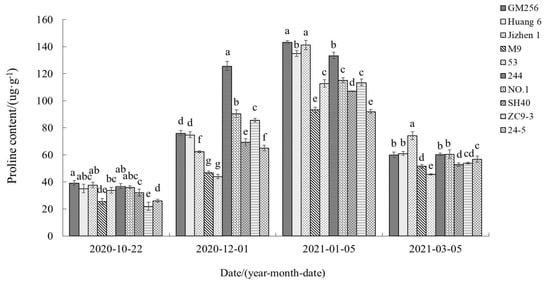 - Javadian, N.; Karimzadeh, G.; Mahfoozi, S.; Ghanati, F. Cold-induced changes of enzymes, proline, carbohydrates, and chlorophyll in wheat. Russ. J. Plant Physiol. 2010, 57, 540–547. [Google Scholar] [CrossRef]