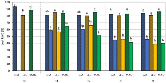 Leaf relative water content (leaf RWC) measured in control and drought olive cultivars from t0 to t4. At t0, the stressed and control samples were still one group. The bars represent mean ± standard error. Values for ‘Giarraffa’ (GIA) are blue, ‘Leccino’ (LEC) values are orange, and ‘Maurino’ (MAU) values are green. Striped bars indicate control samples. For each time point, different letters denote statistical significance (p-value < 0.01) according to Tukey’s multiple post hoc tests considering both cultivar and treatment.