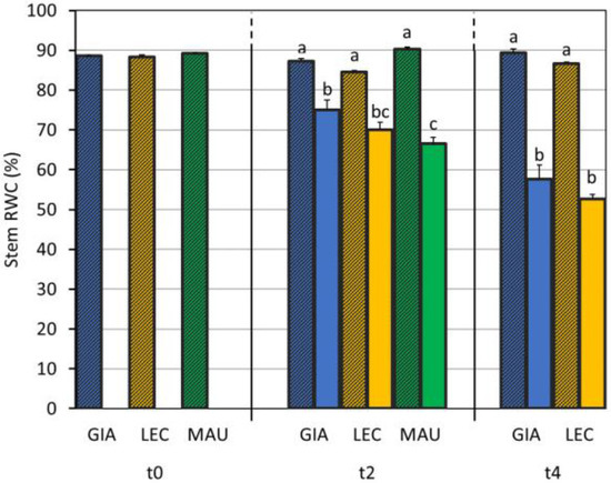 Stem relative water content (stem RWC) measured in control and drought olive cultivars analysed at t0, t2, and t4. At t0, the stressed and control samples were still one group. The bars represent mean ± standard error. Values for ‘Giarraffa’ (GIA) are blue, ‘Leccino’ (LEC) values are orange, and ‘Maurino’ (MAU) values are green. Striped bars indicate control samples. For each time point, different letters denote statistical significance (p-value < 0.01) according to Tukey’s multiple post hoc tests considering both cultivar and treatment. MAU values at t4 are not shown due to technical problems.
