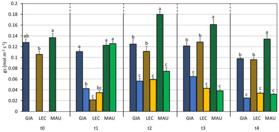 Stomatal conductance (gs) in control and drought-stressed olive cultivars from t0 to t4. At t0, the stressed and control samples were still one group. The bars represent mean ± standard error. The values for ‘Giarraffa’ (GIA) are blue, those for ‘Leccino’ (LEC) are orange, and ‘Maurino’ (MAU) values are green. Strip bars refer to control samples. Within each time point, different letters denote statistical significance (p-value < 0.01) according to Tukey’s multiple post hoc tests considering both cultivar and treatment.