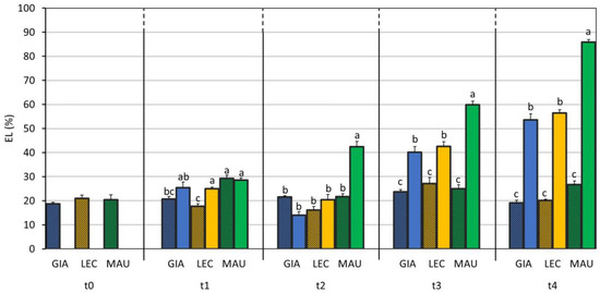 Electrolyte leakage (EL) in control and drought-stressed olive cultivars from t0 to t4. At t0, the stressed and control samples were still one group. The bars represent mean ± standard error. The values for ‘Giarraffa’ (GIA) are in blue, those for ‘Leccino’ (LEC) are orange, and ‘Maurino’ (MAU) values are green. Strip bars refer to control samples. Within each time point, different letters denote statistical significance (p-value < 0.01) according to Tukey’s multiple post hoc tests considering both cultivar and treatment.