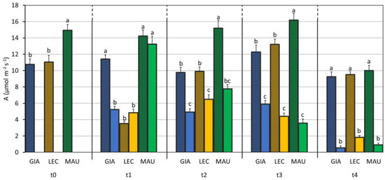 Net CO2 assimilation (A) in control and drought-stressed olive cultivars from t0 to t4. At t0, the stressed and control samples were still one group. The bars represent mean ± standard error. The values for ‘Giarraffa’ (GIA) are in blue, those for ‘Leccino’ (LEC) are orange, and ‘Maurino’ (MAU) values are green. Strip bars refer to control samples. Within each time point, different letters denote statistical significance (p-value < 0.01) according to Tukey’s multiple post hoc tests considering both cultivar and treatment.