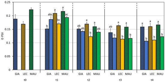 Effective efficiency of PSII (ΦPSII) in control and drought-stressed olive cultivars from t0 to t4. At t0, the stressed and control samples were still one group. The bars represent mean ± standard error. The values for ‘Giarraffa’ (GIA) are blue, those for ‘Leccino’ (LEC) are orange, and ‘Maurino’ (MAU) values are green. Strip bars refer to control samples. Within each time point, different letters denote statistical significance (p-value < 0.01) according to Tukey’s multiple post hoc tests considering both cultivar and treatment.