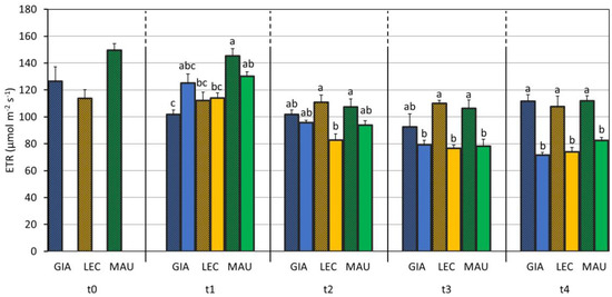 Electron transport rate (ETR) in control and drought-stressed olive cultivars from t0 to t4. At t0, the stressed and control samples were still one group. The bars represent mean ± standard error. The values for ‘Giarraffa’ (GIA) are blue, those for ‘Leccino’ (LEC) are orange, and ‘Maurino’ (MAU) values are green. Strip bars refer to control samples. Within each time point, different letters denote statistical significance (p-value < 0.01) according to Tukey’s multiple post hoc tests considering both cultivar and treatment.