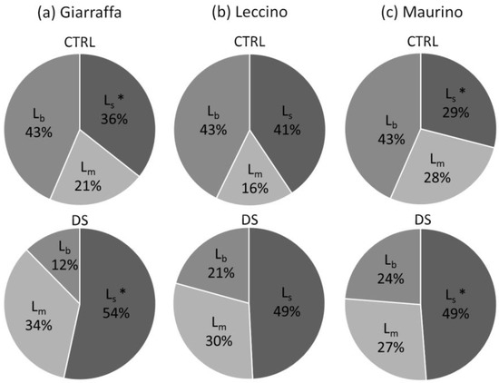 Percentages of stomatal limitation (Ls), mesophyll diffusion resistance (Lm), and biochemical limitation (Lb) on photosynthetic process in control and drought-stressed olive cultivars, calculated for ‘Giarraffa’ (a), ‘Leccino’ (b), and ‘Maurino’ (c) at t2. The percentages shown for each group are the means of five values calculated independently for each limitation (Ls, Lm, and Lb). The asterisks (*) denote statistical significance (p-value < 0.01) according to Tukey’s multiple post hoc test. Only the significant difference between control and stressed samples of the same cultivar is highlighted.