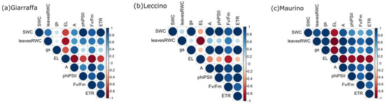 Figure 9 shows correlograms generated for each cultivar. When the cultivars were examined together, they gave very similar results. Firstly, there is a positive correlation between all the parameters, except EL. Therefore, the main difference is the magnitude of the correlation. Looking at the correlations between the water-related parameters (the SWC, the RWC, and gs), the cultivars behaved differently: the cultivar Maurino had the strongest positive correlation between all these parameters. ‘Leccino’ showed the same strong positive correlation between the SWC and gs, but the value was lower when the leaf RWC was correlated with the SWC and gs. In the cultivar, Giarraffa, the correlations of both leaf RWC and SWC with gs were weak, while that between the SWC and leaf RWC was stronger than it was in ‘Leccino’. Concerning the correlation between the water-related parameters and photosynthesis, ‘Maurino’ showed the strongest correlation between the SWC, leaf RWC, gs, and A. The same strong positive correlation was found between A and the SWC in ‘Leccino’. The correlations between the leaf RWC and A (in ‘Leccino’) and the leaf RWC, SWC, and A (in ‘Giarraffa’) are weaker. Moreover, ETR and ΦPSII were strongly positively correlated with gs in ‘Maurino’ and ‘Leccino’, while they were more positively correlated with the leaf RWC in ‘Giarraffa’.