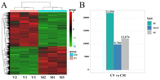 By filtering with FDR < 0.05 and fold change ≥ 1, 21,856 DEGs in C. vestitum had changed significantly compared with C. mongolicum. Hierarchical clustering analysis (HCA) showed a distinct difference in gene expression patterns between C. vestitum and C. mongolicum (Figure 2A). There were 12,076 DEGs that were up-regulated in C. vestitum and 9780 that were down-regulated (Figure 2B).