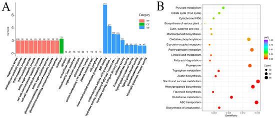 Based on the Nr annotation, the DEGs were classified into 1201 GO categories and mainly assigned to molecular functions and biological processes. In the biological process category, the largest identified term was “response to stress” (GO: 0006950), which contains 216 genes, followed by the aminoglycan catabolic process, amino sugar metabolic process, chitin metabolic process, amino sugar catabolic process, and so on. ADP binding, oxidoreductase activity, acting on paired donors, with oxidation of a pair of donors resulting in the reduction of molecular oxygen to two molecules of water, hydrolase activity, hydrolyzing O-glycosyl compounds (GO: 0004553), and hydrolase activity, acting on glycosyl bonds (GO: 0016798), were the most prominent terms in molecular function. Only “nucleolus” was enrichment in the cellular component category (Figure 3A).