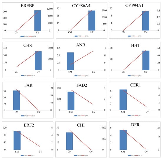 Twelve DEGs were randomly chosen for validation of the reliability of transcriptome data using qRT-PCR with gene-specific primers (Table S1). The results of qRT-PCR were significantly consistent with the FPKM value of the transcriptome data, which demonstrated the reliability of the RNA-seq data (Figure 4).