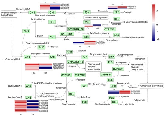 Expression patterns of genes involved in the flavonoid biosynthesis pathway. The expression levels of DEGs in the heatmap obtained with Log2FC. Red represents up−regulated genes, and blue represents down−regulated genes. One the left was C. vestitum and on the right was C. mongolicum in heat map. KEGG Pathway was derived from https://www.kegg.jp/kegg/kegg1.html (accessed on 25 April 2023).