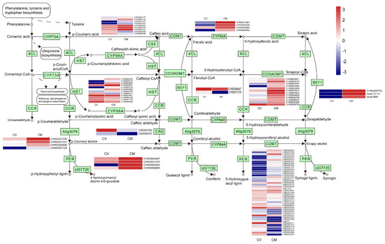 Phenylpropanoid biosynthesis pathway and expression of DEGs involved. The expression levels of DEGs in the heatmap obtained using Log2FC are red for up−regulated and blue for down−regulated. On the left was C. vestitum and on the right was C. mongolicum in heat map. KEGG Pathway was derived from https://www.kegg.jp/kegg/kegg1.html (accessed on 1 May 2023).