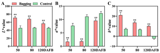 The fruit color index L* reflects brightness, a* represents green (−) or red (+), and b* represents blue (−) or yellow (+), respectively. Compared to bagged ‘Ruby’ fruits, unbagged ‘Ruby’ fruit peel exhibited lower L*, higher a*, and lower b* at all developmental stages, with the skin consistently showing a deep red color (Figure 1) [23]. Interestingly, bagging treatment resulted in the ‘Ruby’ fruit peel showing a bright yellow color at 50 and 80 DAFB (Figure 1). However, at 120 DAFB, the fruit peel ultimately showed a light red color, with decreased L* and b*, and increased a* (Figure 1).