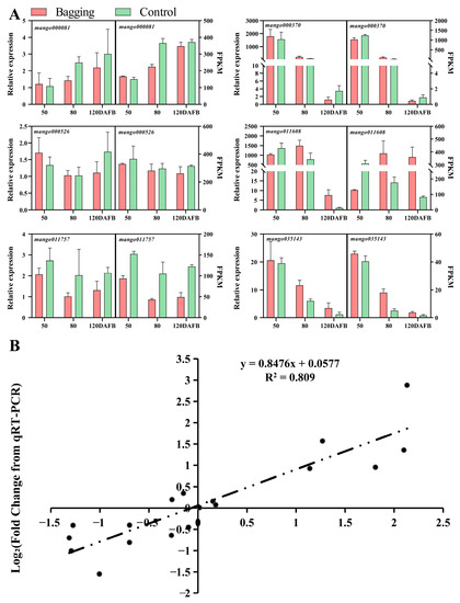 Mango (Mangifera indica L.) is a tropical fruit widely cultivated in both tropical and subtropical regions, with a yield of 54 million tons ranking them the fifth most cultivated fruit in the world (http://www.fao.org/faostat/, accessed on 10 January 2023). The skin color of mangos exhibit green, yellow, or red, and the red-colored cultivars are most preferred by the consumers. PAs, on the other hand, provide an astringent taste, which protect mango fruits against early consumption. At present, researches about the molecular mechanism of mango flavonoid biosynthesis mainly focus on the transcription changes of the flavonoid biosynthetic and regulatory genes [20,21,22], while how these genes are regulated by upstream genes has not been elucidated. In previous studies, we found that bagging the red mango cultivar ‘Ruby’ fruit significantly reduced the content of anthocyanins in the peel compared to unbagged fruits. However, surprisingly, the content of PAs in the peel was increased [23]. These results were divergent when compared with other studies, in which the biosynthesis of flavonoids, including anthocyanins and Pas, is usually induced by light [24,25,26]. We have only analyzed the expression of structural and regulatory genes that regulate anthocyanin biosynthesis [23,27]. Therefore, elucidating genes associated with anthocyanin and proanthocyanidin accumulation in mango peel by bagging treatment has both theoretical and applied significance.