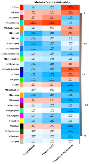 WCGNA of DEGs obtained from RNA-seq of bagged and non-bagged mango peel. The module feature correlation and corresponding p-values are shown in parentheses. There are 27 modules displayed on the left panel. The module trait correlation from −1 (blue) to 1 (red) is represented by the color change on the right. Procyanidin B1, procyanidin B3, and cyanidin-3-O-galactoside on the panel show changes in the concentration of corresponding substances.