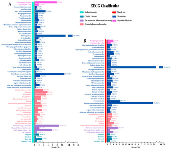 Candidate genes from the turquoise and red modules identified by WGCNA were used for KEGG analysis. The results showed that most candidate module genes belonged to metabolic pathways (33.59% in turquoise, 49.43% in red) and biosynthesis of secondary metabolites (13.05% in turquoise, 28.62% in red) (Figure 4A,B). The turquoise module also enriched plant hormone signal transduction (10.75%) and plant–pathogen interaction (9.6%) (Figure 4A). In addition, carbon metabolism was enriched in red modules (8.46%) (Figure 4B).