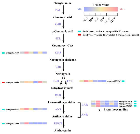 Based on WGCNA, a total of eight structural genes for anthocyanin and PA biosynthesis were identified (Figure 5). One F3H was positively correlated with the content of cyanidin-3-O-galactoside. One CHS, one F3′H, one ANS, three LARs, and one UFGT showed positive correlations with the concentration of procyanidin B3 (Figure 5). All structural genes which exhibited positive correlations with the concentration of procyanidin B3 were significantly induced in the bagged mango peel at 50 DAFB, while structural gene positively correlated to the concentration of cyanidin-3-O-galactide was highly expressed in the control mango peel (Figure 5).