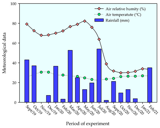 The experiment was conducted under field conditions from September 2019 to February 2021 in an experimental area located in the municipality of Remígio, State of Paraíba, Brazil. The location of the experiment is georeferenced by the coordinates 7°00′0.3″ S and 35°47′54″ W, at an elevation of 562 m above sea level. The climate of the region is classified as As’, i.e., tropical with dry summers and rainfall concentration in the winter and autumn seasons [31]. During the experimental period, daily data on temperature and relative air humidity were collected, showing the respective mean values of 27.5 °C and 68.5%. The cumulative rainfall during the period was 852.2 mm (Figure 1).