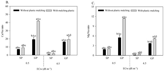 K/Na (A), Ca/Na (B), and Mg/Na (C) foliar ratio in sour passion fruit propagated by seeds (SP) and grafting (GP) and irrigated with saline water in soil with and without plastic mulching. The vertical bar represents the standard error of the mean (n = 4). For the same treatment, means with the same lowercase letters do not indicate a significant difference (p > 0.05) for soil without and with mulching, and means with the same uppercase letter indicate no significant difference (p > 0.05) for seed propagation via seeds and grafting, while equal Greek letters indicate no differences between plants irrigation with water of low and high salinity.