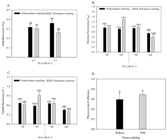 Initial fluorescence of sour passion fruit irrigated with saline water and plastic mulching (A), maximum and variable fluorescence of sour passion fruit irrigated with saline water, plastic mulching, and propagation methods (B,C), and efficiency of photosystem II of sour passion fruit in soil with plastic mulching (D). The vertical bar represents the standard error of the mean (n = 4). For the same treatment, means with the same lowercase letter indicate no significant difference (p > 0.05) for soil without and with mulching; means with the same uppercase letter indicate no significant difference (p > 0.05) for seed propagation and grafting; and means with the same Greek letter indicate no significant difference for irrigation with water of low and high salinity.