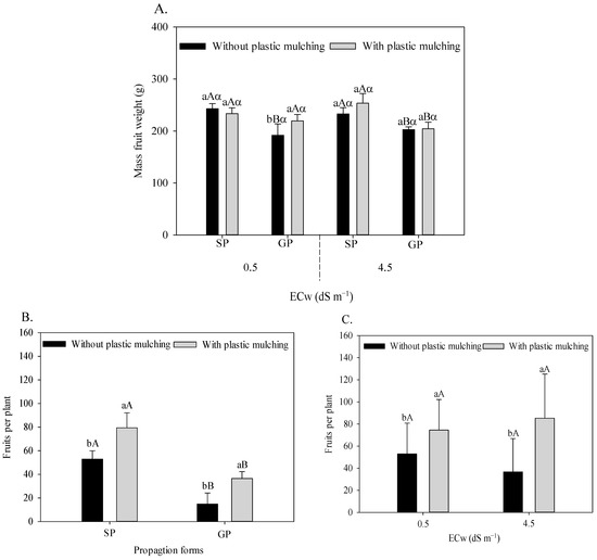 Mean fruit weight of sour passion fruit (A) propagated by seeds (SP) and grafting (GP), irrigated with saline water in soil with and without plastic mulching; number of sour passion fruits in plants propagated by seeds (SP) and grafting (GP) in soil with and without mulching (B); and irrigated with low- and high-salinity water in soil with plastic mulching (C). The vertical bar represents the standard error of the mean (n = 4). For the same treatment, means with the same lowercase letter indicate no significant (p > 0.05) for soil without and with mulching, means with the same uppercase letter indicate no significant difference (p > 0.05) for seed propagation and grafting, and means with the same Greek letter indicate no difference (p > 0.05) for irrigation with water of low and high salinity.