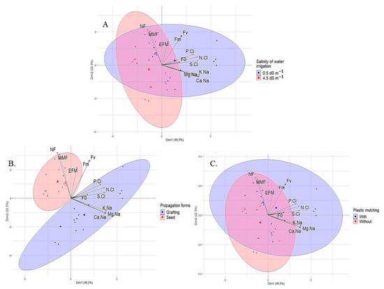 Results of the principal component analysis and clustering analysis among the sour passion fruit variables analyzed and irrigation water salinity (A); propagation method (B); and plastic mulching (C).