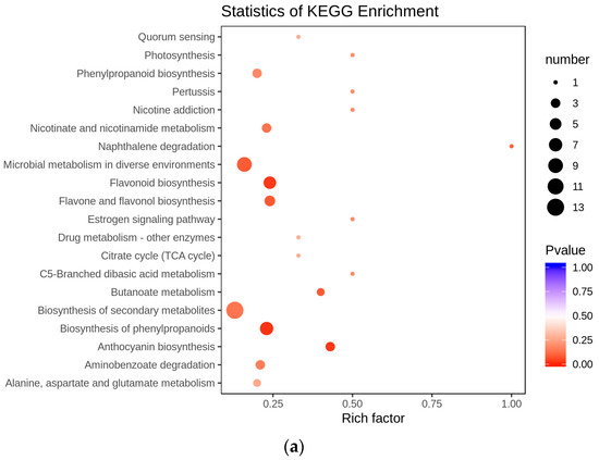 To focus on the metabolites related to fruit development and flavor formation, we performed KEGG enrichment analysis on different metabolites. The main enriched KEGG terms for Dabenzi juices were biosynthesis of phenylpropanoid (map01061), flavonoid biosynthesis (map00941), and anthocyanin biosynthesis (map00941). The main enriched KEGG terms for ‘Tunisia’ juices were biosynthesis of phenylpropanoid (map01061), flavonoid biosynthesis (map00941), and phenylpropanoid biosynthesis (map00940). The common pathways related to both cultivars were enriched in flavonoid biosynthesis (map00941) and a branched pathway of phenylpropanoid biosynthesis (map00940) (Figure 4). To understand the genetic mechanism of flavonoid metabolism, transcriptome sequencing was conducted on the corresponding samples. There were 1637 and 2441 differentially expressed genes (DEGs) and 521 common genes for ‘Dabenzi’ and ‘Tunisia’, respectively, during fruit development (Figure S2a), which were enriched in metabolic pathway (map01100) and flavonoid biosynthesis (map00941) (Figure S2b). The enriched metabolic pathway of these DEGs was in accordance with the enriched metabolic pathway of different accumulated compounds. The high expression of Pgr022711.1 encoding PgrPAL and Pgr010283.1 encoding PgrC4H in Dabenzi at the early developmental stage contributed to p-coumaroyl-CoA production, providing sufficient precursors for the synthesis of flavonoids in ‘Dabenzi’. Chalcone isomerase (CHI) catalyzes the conversion of chalcone to naringenin, the core compound in the flavonoid biosynthetic pathway. The high expression of Pgr025966.1 encoding CHI in ‘Tunisia’ at early development may lead to a greater accumulation of naringenin and a less accumulation of down-stream compounds (flavones, flavonols, and anthocyanin) in ripe fruits of ‘Tunisia’ due to the low expression of Pgr013784.1, Pgr013787.1, Pgr013789.1 encoding F3′H, Pgr013655.1 encoding F3H, and Pgr026644.1 encoding F3′5′H. DFR and ANS were the key enzymes involved in anthocyanin and flavonol synthesis. The higher contents of anthocyanins and flavonols may be ascribed to the greater transcription accumulation of genes encoding DFR, ANS, and so on.