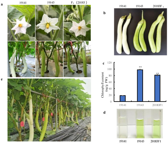 Phenotypes and chlorophyll content. (a) Flower and fruit phenotypes of the parental lines (19141 and 19143) and their F1 (20183). (b) Phenotype of fruits for chlorophyll content determination. (c) Chlorophyll content of the parental lines 19141 and 19143 and their F1 (20183). (d) Chlorophyll extracting solution of the parental lines (19141 and 19143) and their F1 (20183). (e) The peel color separation in the F2 population. Vertical bars in panel c represent the standard deviation of the mean (n = 3). ** indicates statistically significant differences (p < 0.01).