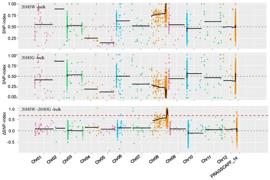 Distribution graph of the SNP−index and ΔSNP−index of the white-peeled bulk (20183W-bulk) and green-peeled bulk (20183G-bulk). X-axis represents the position of twelve chromosomes of Solanum melongena, and Y-axis represents the SNP-index. The red dashed line indicates the threshold line.