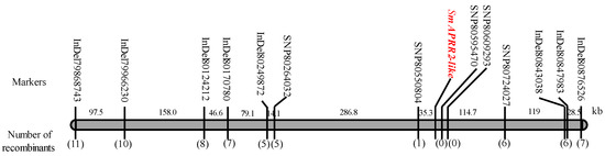 The genome sequence of the Gv1 candidate interval was downloaded from the reference genome ‘SME_HQ’ (http://eggplant-hq.cn/Eggplant/home/index, accessed on 6 July 2021) [15]. Based on the analysis results of genome re-sequencing of the two parents (19141 and 19143), InDel markers were developed by designing primers according to its flanking sequence (400 bp on each side) and PCR products detected on a 6% polyacrylamide denaturing gel. The SNP markers were analyzed with PARMS (Penta prime amplification reflex mutation system) technology [17]. Genotyping was performed on individual plants of the F2 population, and recombinant plants were screened according to the comparison of genotype and peel color phenotype of individual plants. Primers for InDel and SNP Markers are listed in Table S1.