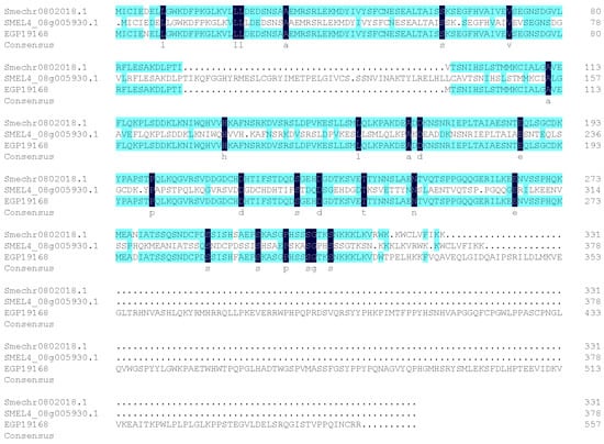In genome consortium V4, the CDS length of SMEL4_08g005930.1 (SmAPRR2-like) was 1137 bp, encoding 378 amino acids (AA), while in the GUIQIE-1 genome, the CDS length of EGP19168 (SmAPRR2-like) was 1674 bp, encoding 557 AA (Figure 5). The sequence of EGP19168 had the highest coverage and homology with the reported tomato gene SlAPRR2-like.