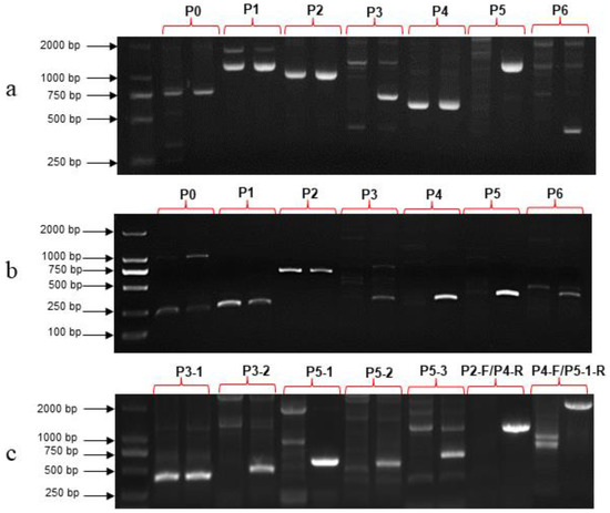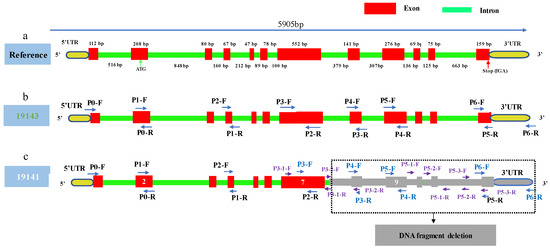 Using the 19141 cDNA as a template, primers P0, P1 and P2 had amplification products, while the other four pairs of primers (P3, P4, P5 and P6) had no amplification products (Figure 6b, Table S4). As for 19141 DNA as a template, P3, P5 and P6 primers had no products (Figure 6a, Table S4). The results of sequencing and splicing showed that the sequence of 19141 amplified with primers P0, P1 and P2 was the same as that of 19143, but the length of the amplified product of P4 primer was 623 bp, 13 bp shorter than that of 19143, and their homology was 90.88% (Figure S3). BLAST results showed that the sequence of amplification with P4 primer combination in 19141 was identical to the region from 34,923,339 to 34,923,961 on chromosome four of the reference genome ‘SME_HQ’ and from 34,594,293 to 34,593,693 on chromosome four of the eggplant V4 genome. In order to find out the reason why 19141 DNA could not be amplified using P3 and P5 primer combinations, two pairs of primer combinations P3-1 and P3-2 (Table S1) were designed near the P3 amplification region, and the results showed that only P3-1 had target size fragment amplification (Figure 6c, Table S4). Three pairs of primer combinations—P5-1, P5-2 and P5-3 (Table S1)—were designed in the P5 amplification region, but none of them had amplification products in 19141 (Figure 6c, Table S4). In addition, there was no product via PCR amplification with P2-F/P4-R and P4-F/P5-1-R primer combinations (Figure 6c, Table S4).
