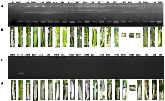 The primer combination P3 for the SmAPRR2-like gene was used to detect 80 accessions of eggplant with green fruit or white fruit. As could be seen from Figure 8, 706 bp target bands were amplified in all green-peel accessions (Figure 8a,b), 23 of 26 accessions with white-peel had no PCR product (Figure 8c,d, Table S5), and three white-peel accessions, namely, 19142, 21260, and 21393, had PCR product around 700 bp (Figure S5, Table S5). The above three special accessions also had no PCR product around 1300 bp when amplified with P5 primer combination (Figure S5). The above results indicated that there might be other forms of mutations of SmAPRR2-like besides deletion.