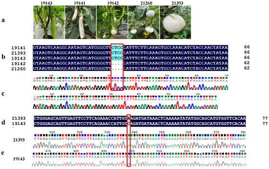 The genetic variations in SmAPRR2-like. (a) Fruit phenotype of different accessions. (b,c) sequence comparison of the fourth exon of SmAPRR2-like in different eggplant accessions. (d,e) sequence comparison of the sixth exon of SmAPRR2-like in different eggplant accessions. 19143 represented normal green-peel accessions, 19142 and 21260 represented DNA sequence of white-peel accessions with frameshift variant, and 21393 represented DNA sequence of white-peel accessions with nonsense variant (premature stop codon) at the 120th amino acid.
